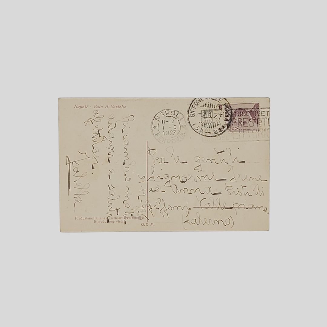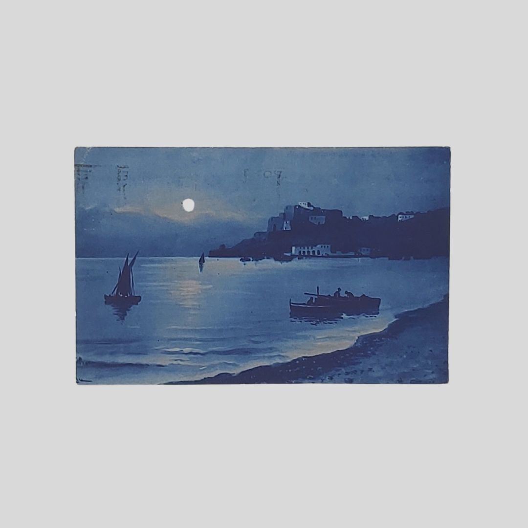 Cartolina in eliotipia d’epoca, acquarellata. Viaggiata, invio del 31/12/1926, cm 14×9. G. C. M. Francobollo, timbri, annullo propagandistico “Sottoscrivete il prestito del littorio”. In buone condizioni. Barche in primo piano. Rara. Non comune veduta notturna del Castello di Baia.