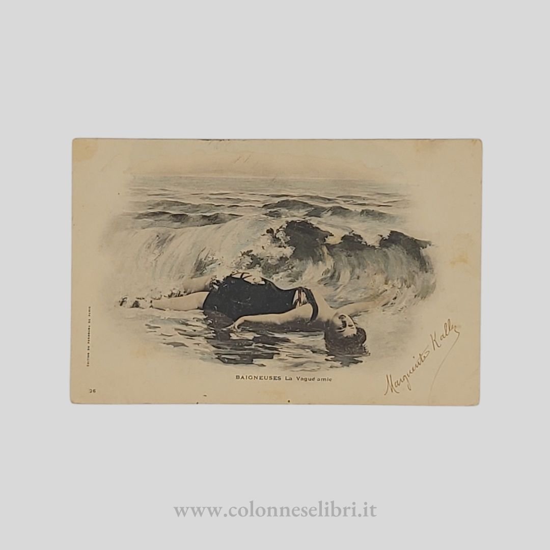 Undivided back, cm 9x14. Cartolina viaggiata, francobollo, doppio timbro postale. Raffigurante una giovane donna nell'atto di accogliere "l'onda amica". Tracce d'uso.