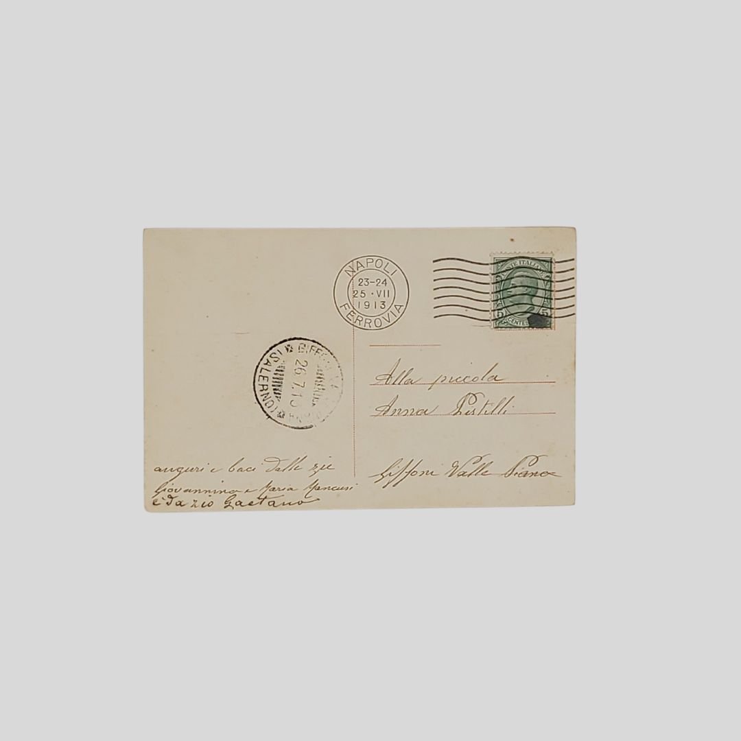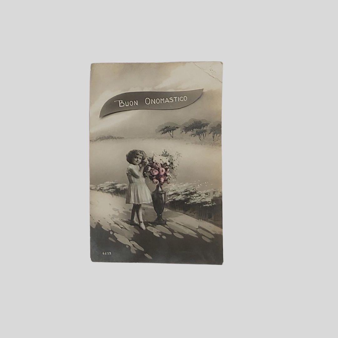 Cartolina augurale fotografica d’epoca. Viaggiata, cm 9×13,5. Francobollo, timbri (25/7/1913). Lievemente ondulata. Piccola piegatura all’angolo superiore. Serie 6259.