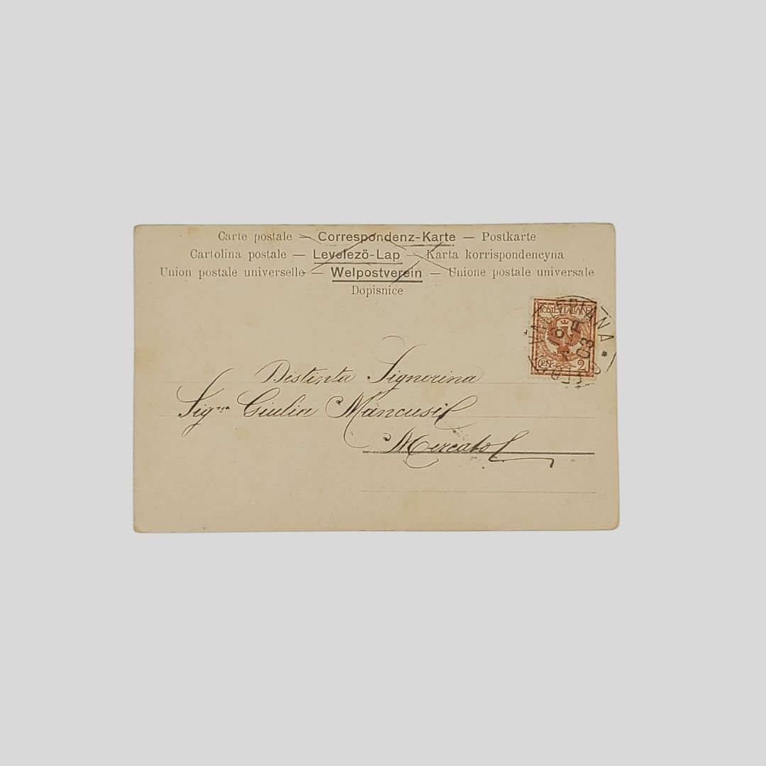 Cartolina d’epoca. Undivided back. Viaggiata, cm 9×14, s.d. (primi ‘900). Francobollo, timbro. In buone condizioni.
