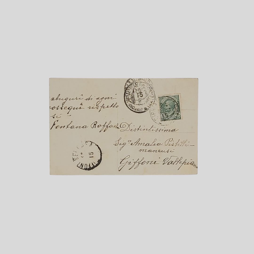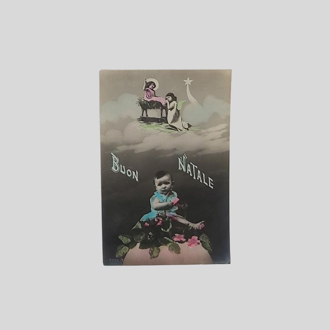 Cartolina augurale d’epoca. Viaggiata, cm 8,5×13,5. Francobollo, timbri (24/12/1915). Lievemente ondulata. Serie 7296/2