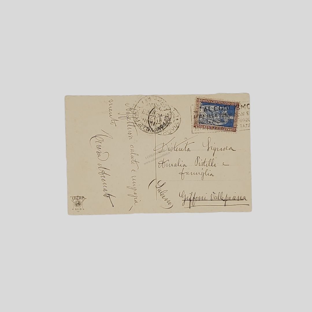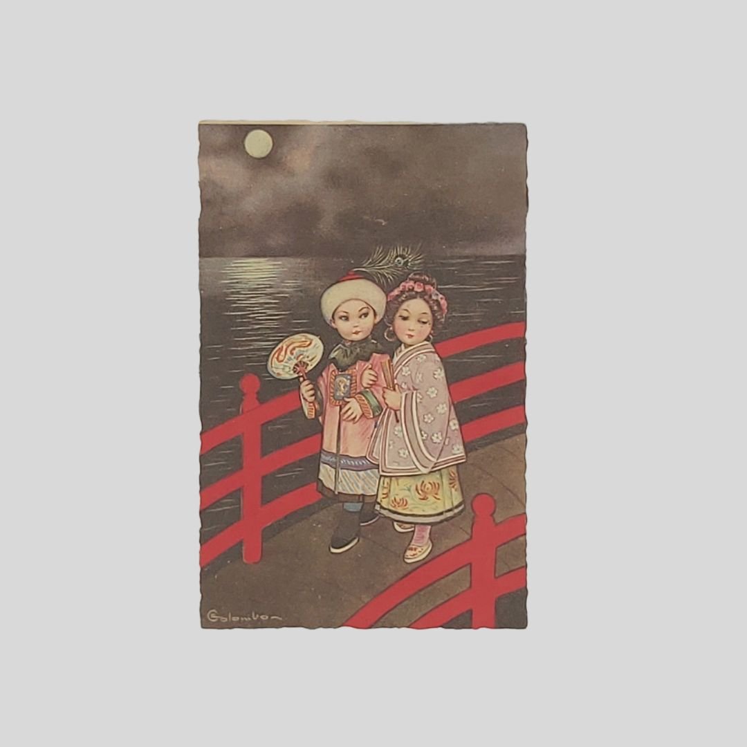 Cartolina d’epoca con bordi ondulati a firma Emilio Colombo. Viaggiata, cm 9×14. Francobollo, timbri, postalizzata il 19/10/1928. In buone condizioni.