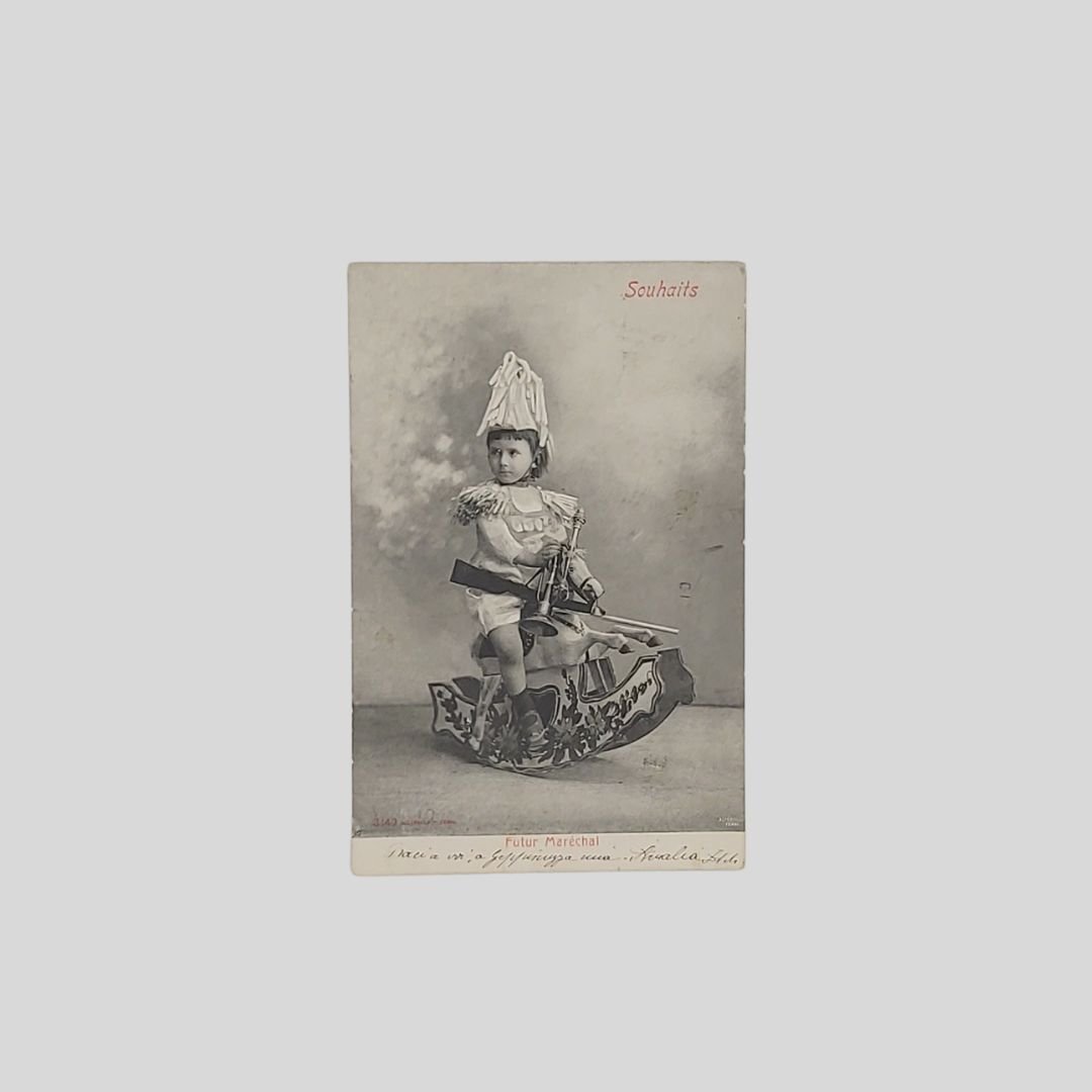 Bambino su cavallo a dondolo. Futur Maréchal.