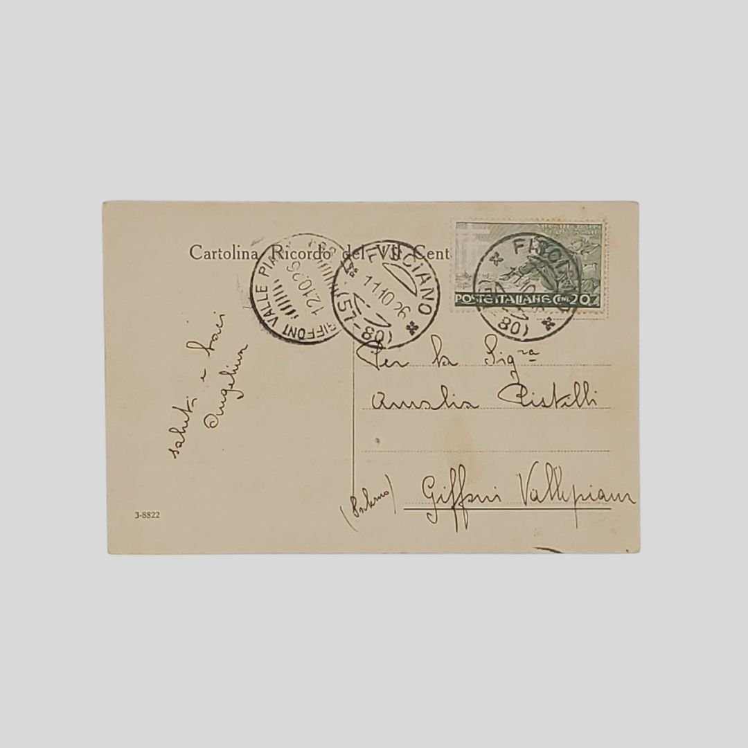 Cartolina d’epoca virata in seppia. Viaggiata, cm 14×9. Francobollo, timbri, postalizzata l’11/10/1926. In buone condizioni. Rara.