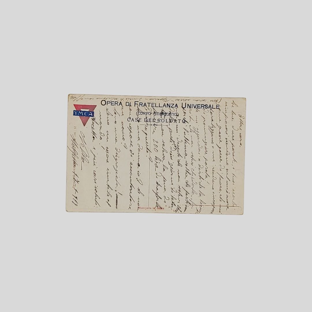 Cartolina YMCA, Opera di Fratellanza Universale (Corpo Americano). Casa del Soldato. Non viaggiata, ma con invio di mano sincrona, datata 17/1/1919, cm 9x14. Tracce d’uso agli angoli.