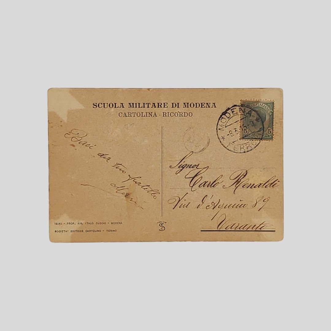 cm 14×9. Cartolina d’epoca. Ricordo della Scuola Militare di Modena. Viaggiata. Francobollo e timbro, postalizzata a Modena il 8/3/1915, con invio a Taranto. Segni di pressione da album agli angoli. Rara.