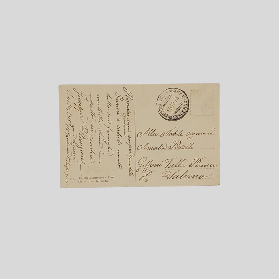 cm 14×9. Cartolina d’epoca. Viaggiata. Franchigia militare. Inviata dalla «zona di guerra. 1a Compagnia, 118° Fanteria» l’11/10/1915 e diretta in provincia di Salerno (15/10/1915). Timbro postale. In buone condizioni. Al recto versi di V. E. Bravetta. Molto rara. L’Italia turrita avvolta nel tricolore, a cavallo con la spada sguainata, guida l’assalto.
