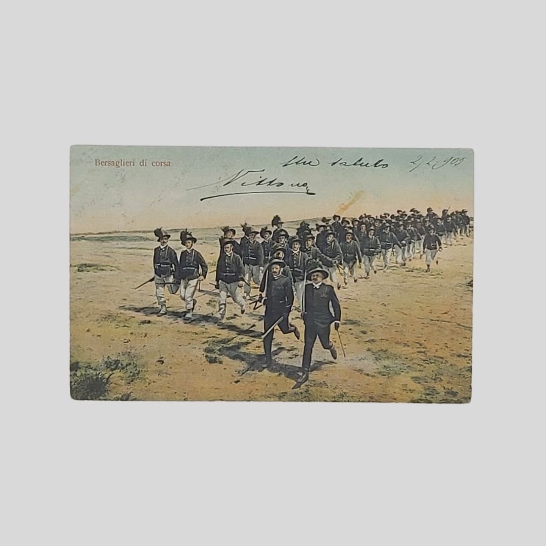 Bersaglieri di corsa. Cartolina originale in fotocromolitografia del Regio esercito.