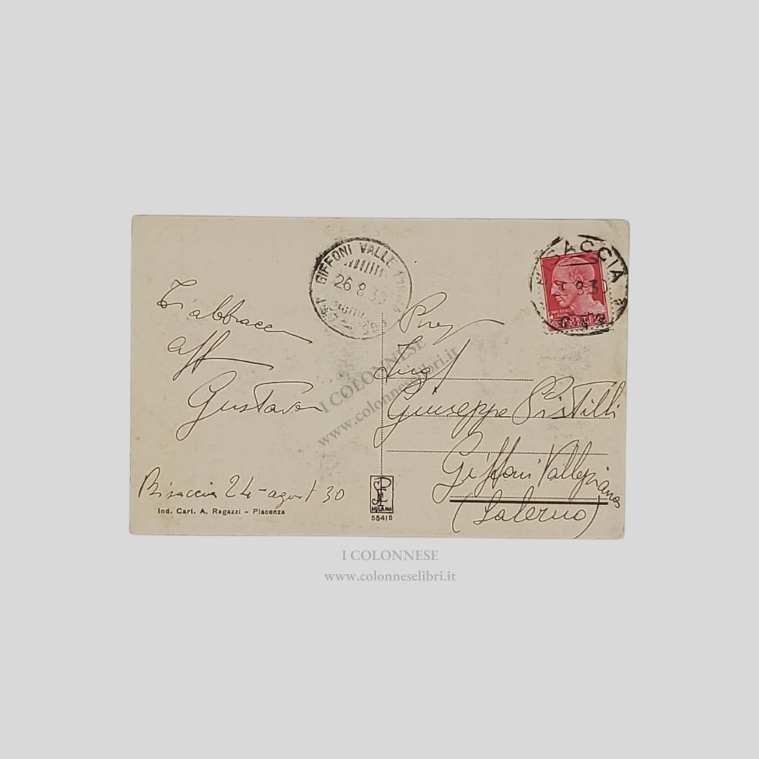 Cartolina fotografica originale viaggiata, cm 14×8,7, 24/8/1930, timbri e francobollo. Animata sullo sfondo. Tracce d’uso agli angoli. Rara.