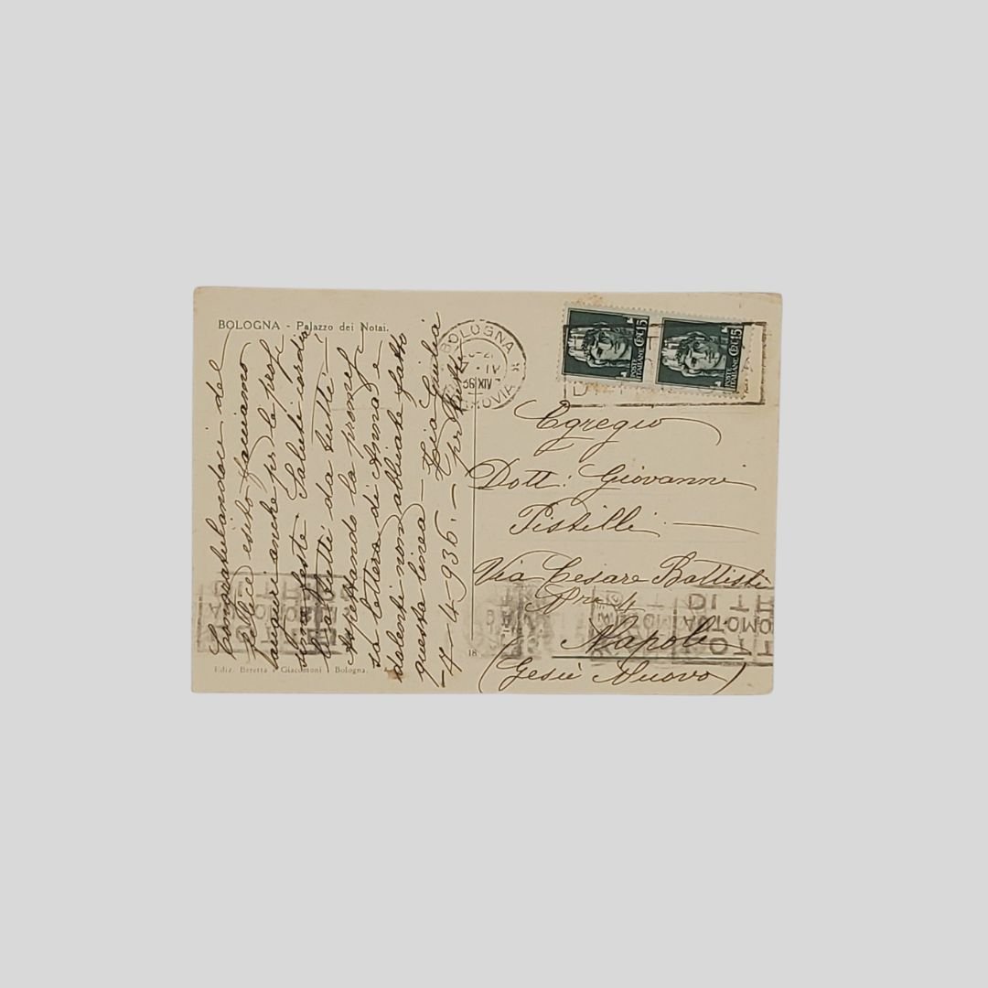 cm 15×10. Cartolina d’epoca. Viaggiata, invio del 7/4/1936. Francobolli, timbro. Molto animata. Tracce d’uso agli angoli.