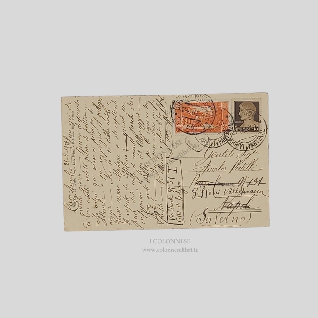 cm 13,5×9. Cartolina fotografica originale. Viaggiata, 21/8/1929. Timbri e francobolli. Tracce d’uso, piegoline agli angoli.