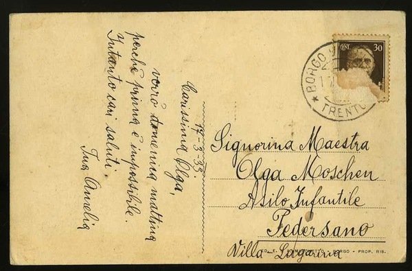 Cartolina in bianco e nero di misure 14x9 cm. Condizioni : USATO - Stato : Buono, ordinari segni d'uso e del tempo. Altre note : Viaggiata con francobollo e timbro di annullo di Borgo Valsugana.