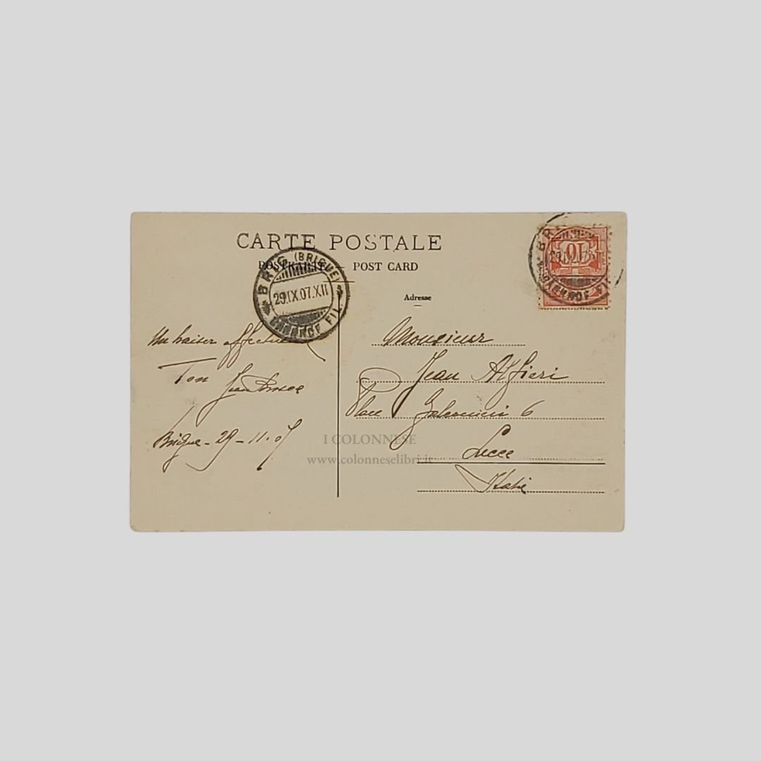 cm 14×9. Francobollo, timbri (29/11/1907). Lieve alone del timbro al recto. Animata, in primo piano carrozza con cavallo.