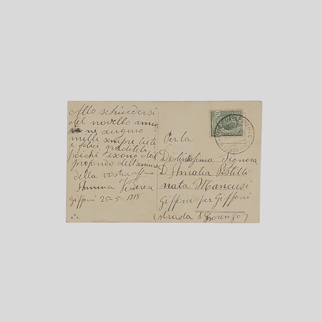 Cartolina augurale d’epoca. Viaggiata, invio del 25/5/1918, cm 14×9. Francobollo, timbro. Tracce d’uso.