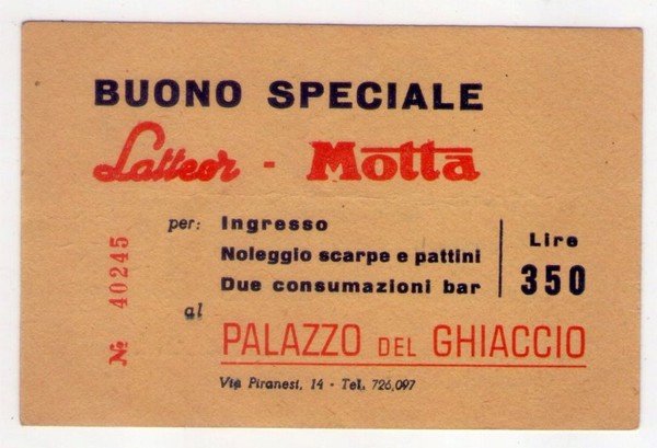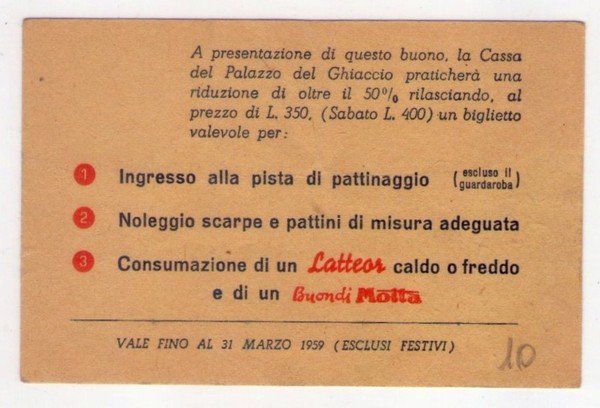 Buono speciale Latteor - MOTTA. Ingresso e noleggio pattini Palazzo del Ghiaccio. 1959