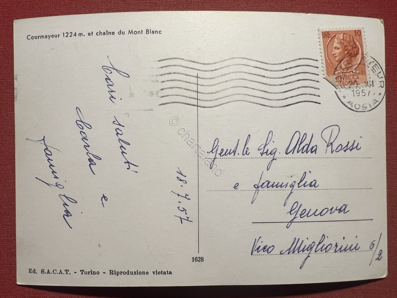 Cartolina - Courmayeur ( Valle d'Aosta ) e Catena del Monte Bianco - 1957
