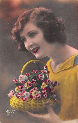 Cartolina - Postcard - Donna - cestino di fiori