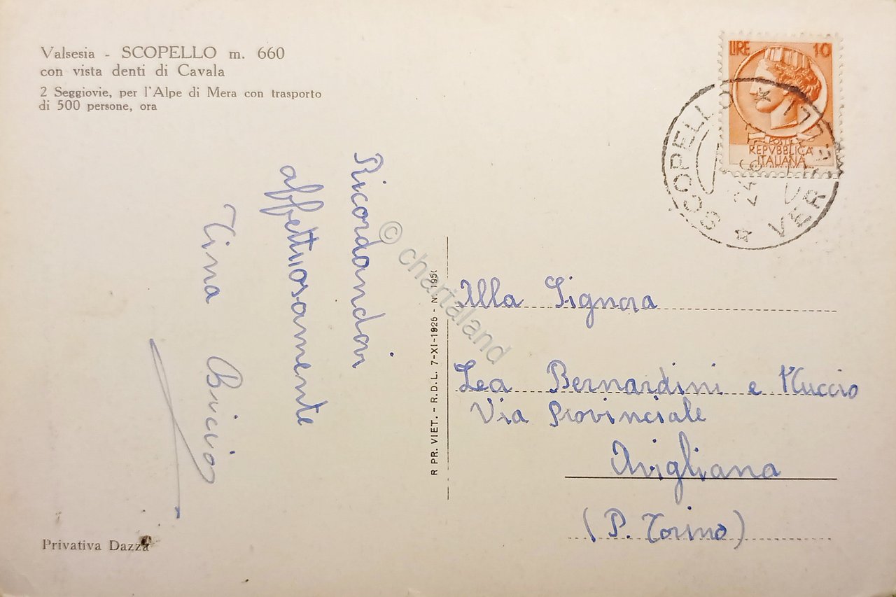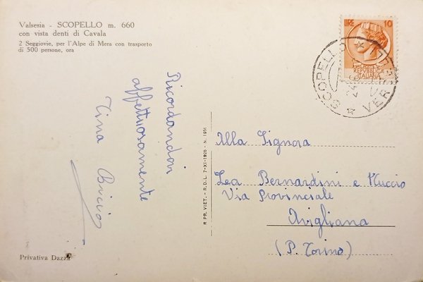 Cartolina - Valsesia - Scopello con vista denti di Cavala ( Vercelli ) - 1957
