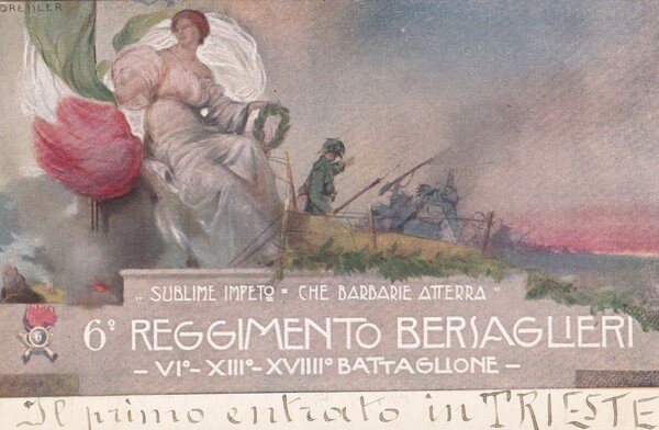 Cartolina 6°Reggimento Bersaglieri - VI°-XIII°-XVIIII° battaglione il primo entrato a Trieste.