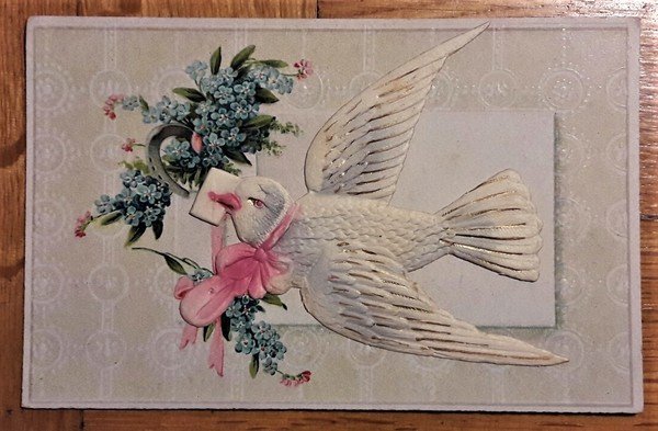 Cartolina a rilievo con applicazione tridimensionale pop-up augurale Buona Pasqua (colomba-lettera-fiori). Primi'900