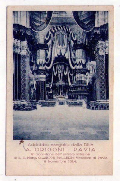 Cartolina Addobbo eseguito dalla Ditta A. Origoni - Pavia in occasione dell'entrata solenne di S.E. Mons. Giuseppe Ballerini Vescovo di Pavia. 9 Novembre 1924