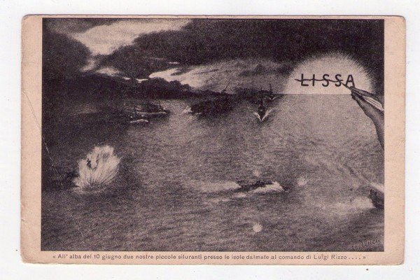 Cartolina "All'alba del 10 Giugno due nostre piccole siluranti presso le isole dalmate al comando di Luigi Rizzo" Lissa