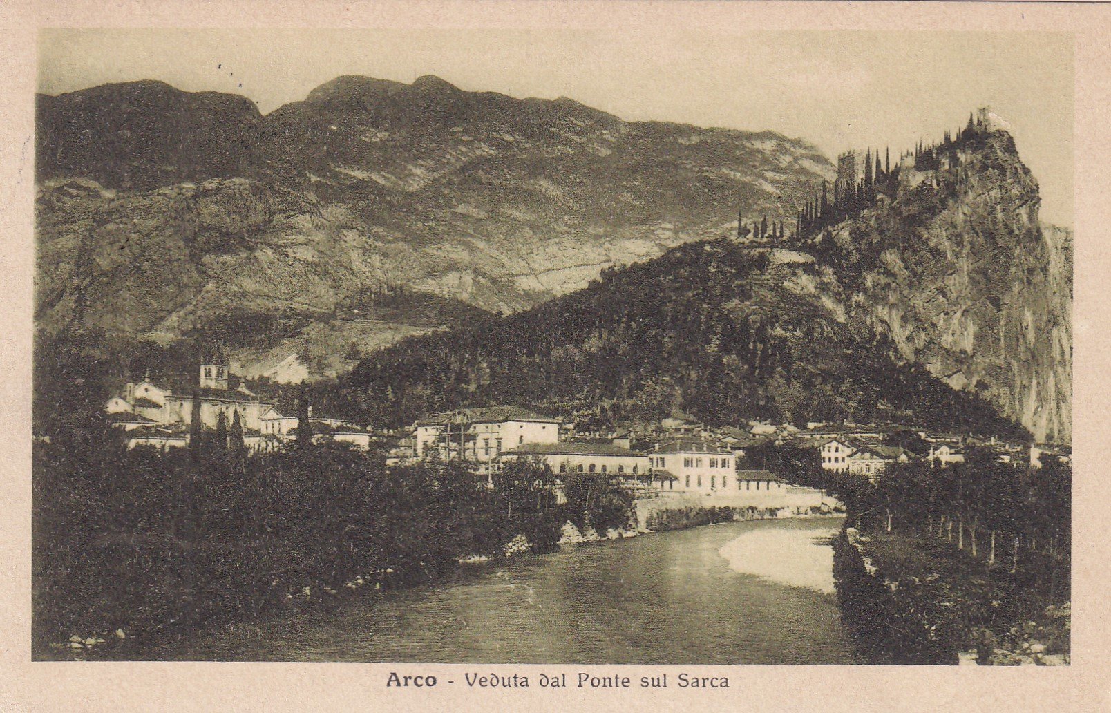 Cartolina ARCO - Veduta dal Ponte sul Sarca. Timbro 1° Reggimento Granatieri. 1915