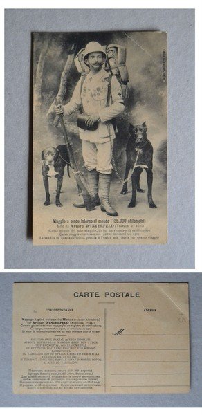 Cartolina autofinanziamento Viaggio a piede intorno al mondo fatto da ARTURO WINTERFELD (Tedesco, 27 anni) 1915 ca.