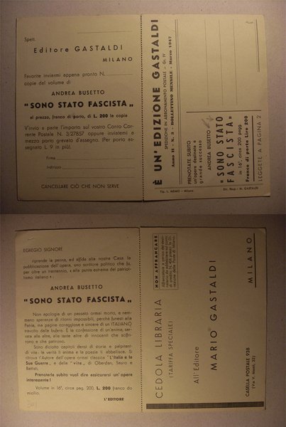 Cartolina / cedola pubblicitaria "Edizione GASTALDI. Andrea Busetto - Sono stato fascista" 1947