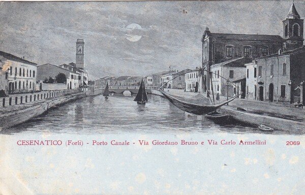 Cartolina Cesenatico (Forlì) - Porto Canale - Via Giordano Bruno e Via Carlo Armellini.