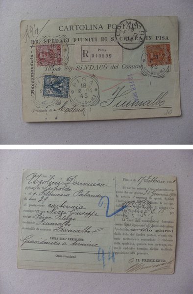 Cartolina da ricovero R.R. Spedali Riuniti di Santa Chiara in Pisa 1904 (gravidanza)