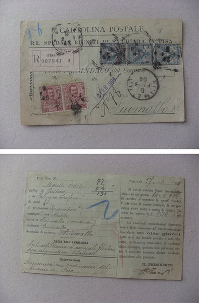 Cartolina da ricovero R.R. Spedali Riuniti di Santa Chiara in Pisa 1904
