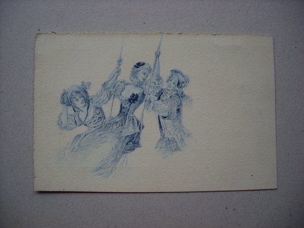 Cartolina damina su altalena incisione all´acquaforte. Primi´900