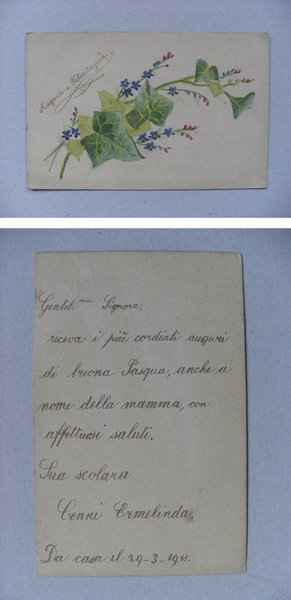 *Cartolina dipinta a mano "Auguri e Felicitazioni - Buona Pasqua 1918" (foglie,fiori)