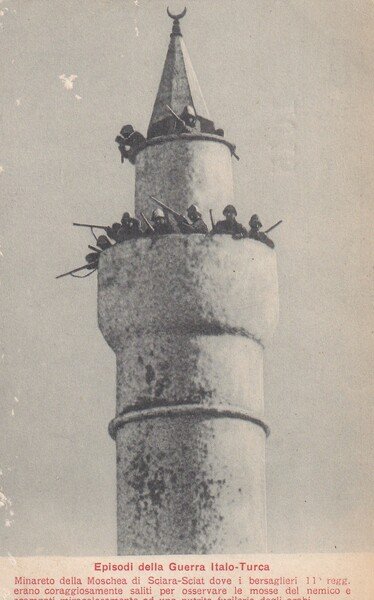 Cartolina Episodi della Guerra Italo - Turca. Minareto della Moschea di Sciara-Sciat