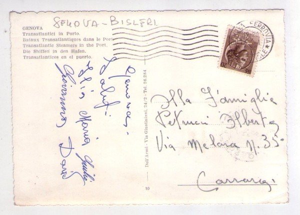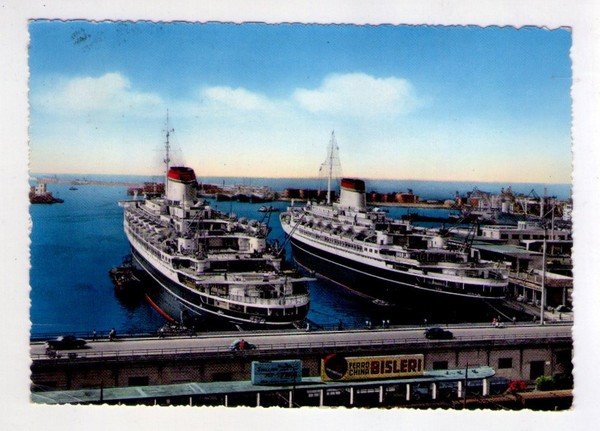 Cartolina GENOVA (Ferro China Bisleri). Transatlantici in Porto. 1958