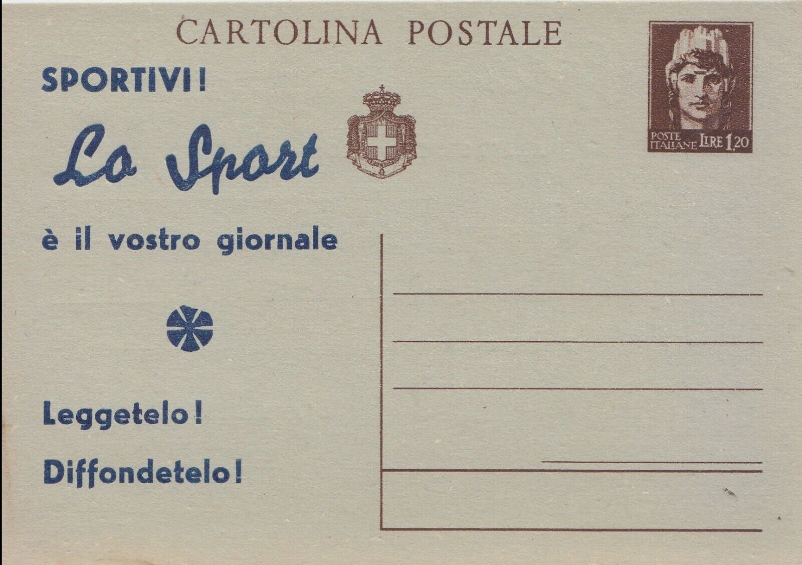 CARTOLINA postale pubblicitaria della serie Italia Turrita del 1945 da 1,20 lire del Giornale LO SPORT di Bari . Non viaggiata. Stato di conservazione: molto buono (piccola ingiallitura all'angolo inferiore destro, come da foto)
