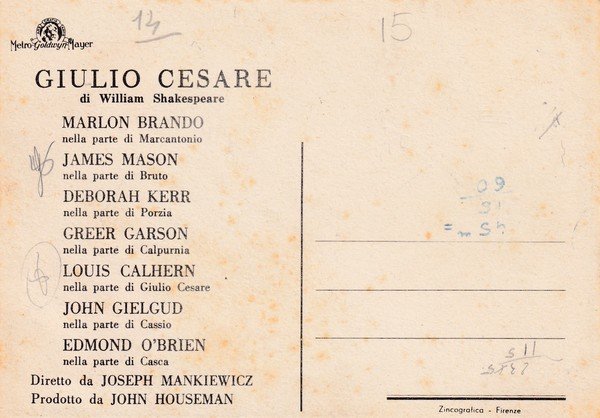Cartolina GIULIO CESARE di William Shakespeare (Marlon Brando, James Mason, Deborah Kerr). Joseph L. Mankiewicz