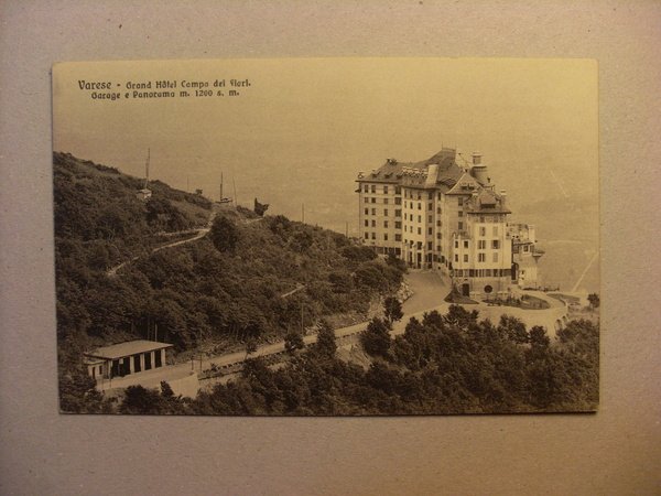 Cartolina Grandi Sports Invernali al "Campo dei Fiori" di VARESE. Grand Hotel Campo dei Fiori, Garage e Panorama.