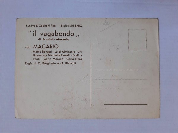 Cartolina IL VAGABONDO di Erminio Macario. Prod. Capiteni Film. Regia Borghesio e Biancoli.