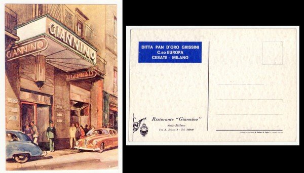 Cartolina illustrada da Aldo Raimondi "Ristorante GIANNINO - Milano" - "Ditta Pan d'Oro Grissini - Milano"