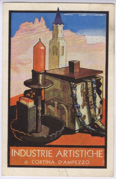 Cartolina illustrata: industrie artistiche di Cortina d'Ampezzo.