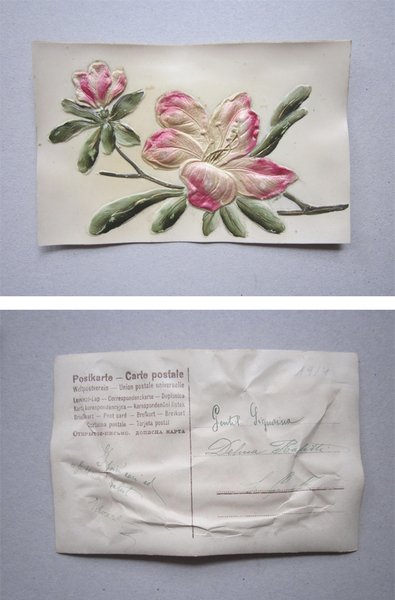Cartolina in plastica termo compressa dipinta a mano (fiori) Primi'900