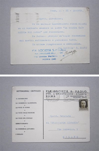 Cartolina / invio "Pia Società S.Paolo per l'apostolato - Stampa ROMA" con firma del Direttore ANGELO PORTALUPPI 1938