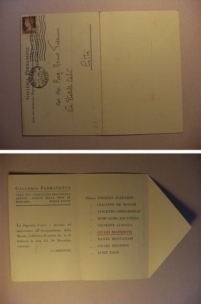 Cartolina invito"Galleria Permanente - Sede del Sindacato Regionale Artisti.Sezione Privincia BERGAMO"1929(Masseroni)