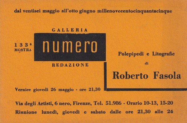 Cartolina/invito Mostra 133° ROBERTO FASOLA. Galleria Numero - Firenze