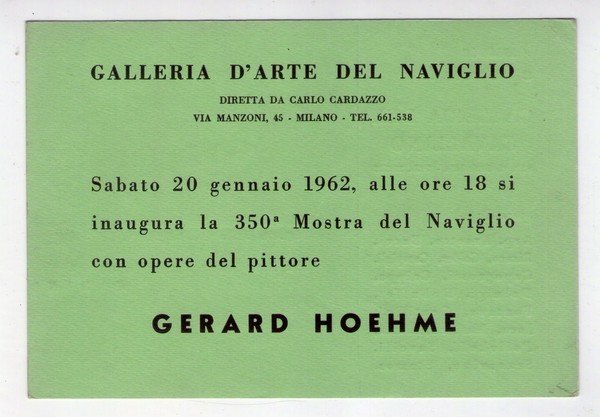 Cartolina/invito Mostra GERARD HOEHME. Galleria d´Arte del Naviglio di Carlo Cardazzo - Milano 1962