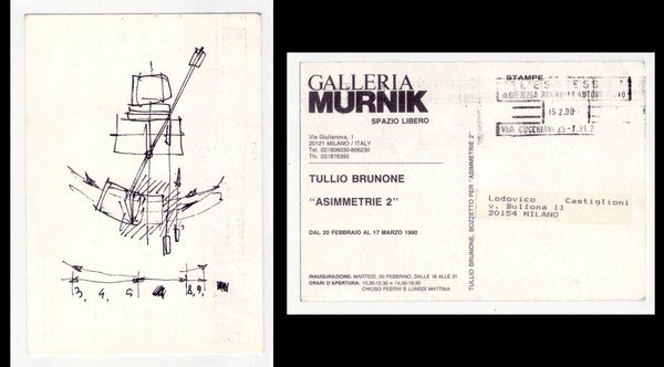 Cartolina invito TULLIO BRUNONE "Asimmetrie 2" Galleria Murnik Spazio Libero - Milano.1990