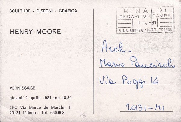 Cartolina/Invito Vernissage HENRY MOORE Sculture-Disegni-Grafica. 2RC Milano 2 aprile 1981