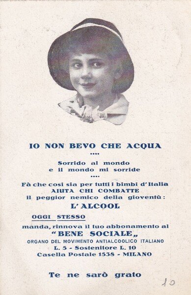 Cartolina "Io non bevo che acqua" BENE SOCIALE organo del movimento Antialcolico Italiano - Milano